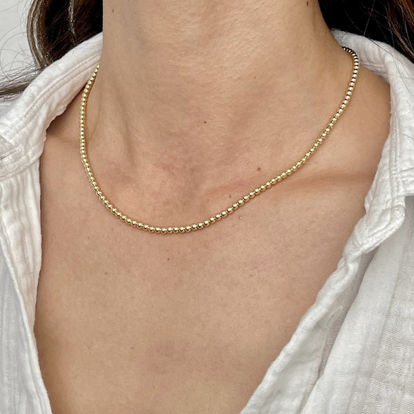 If you prefer the necklace form, we got you. With our 14k yellow gold 3mm ball necklace — a versatile and timeless accessory that effortlessly complements the spirit of fresh beginnings, you can celebrate the New Year in radiant style. The delicate 3mm balls form a refined chain, creating an understated yet captivating look. It is truly a piece that embodies the essence of new possibilities.