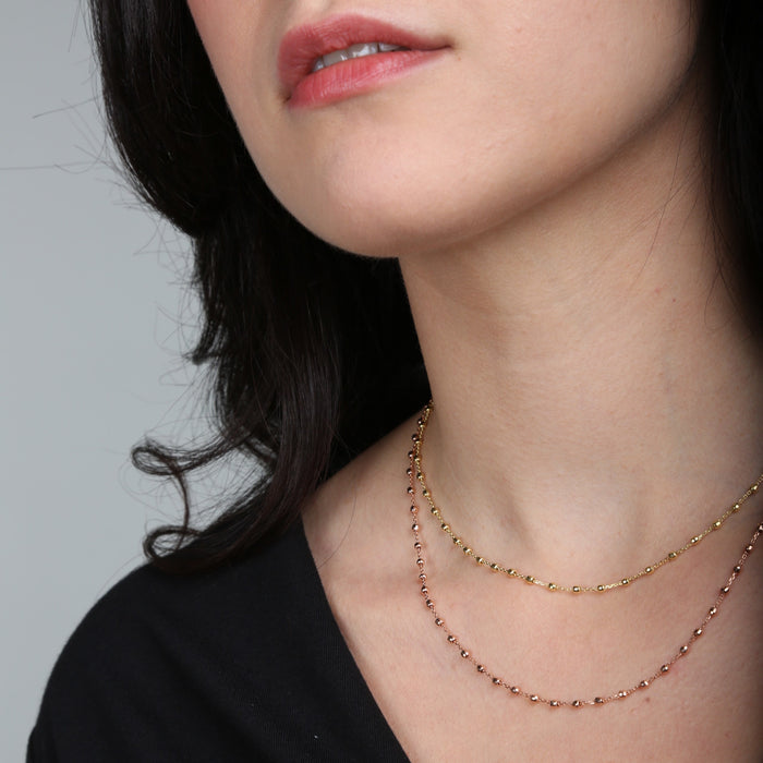 If layering is your thing, the 14k Saturn Bead necklace is just what you need. It comes in three colors: yellow, white, and rose gold. Layering these three colors would definitely check the box on your list of ways to wear rose gold jewelry with other types of gold.