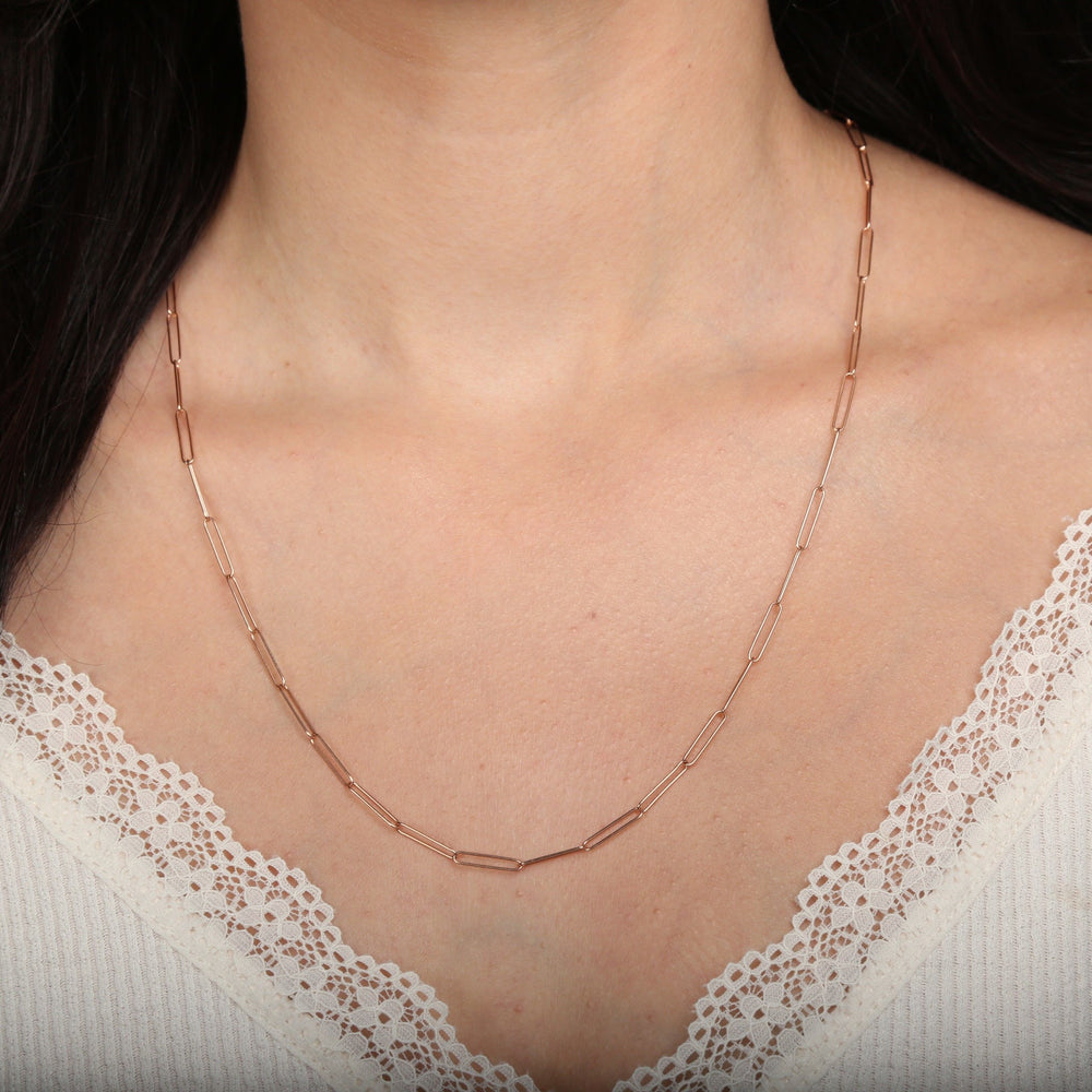 Start with our Signature 14k rose gold long paperclip necklace. It is the perfect accessory to welcome the arrival of spring! As the season blooms with fresh energy and vibrant colors, elevate your style with this exquisite piece that captures the essence of renewal and elegance.