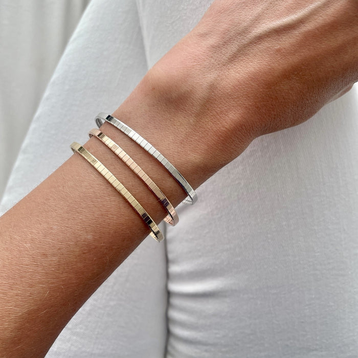 The 14k rose gold Omega bracelet is crafted with meticulous attention to detail and adorned with the warm hues of 14k rose gold. It is a must-have accessory for the season. Whether worn alone as a showpiece or layered with other bracelets for a trendy look, this timeless jewelry brings a touch of polished sophistication to every occasion.