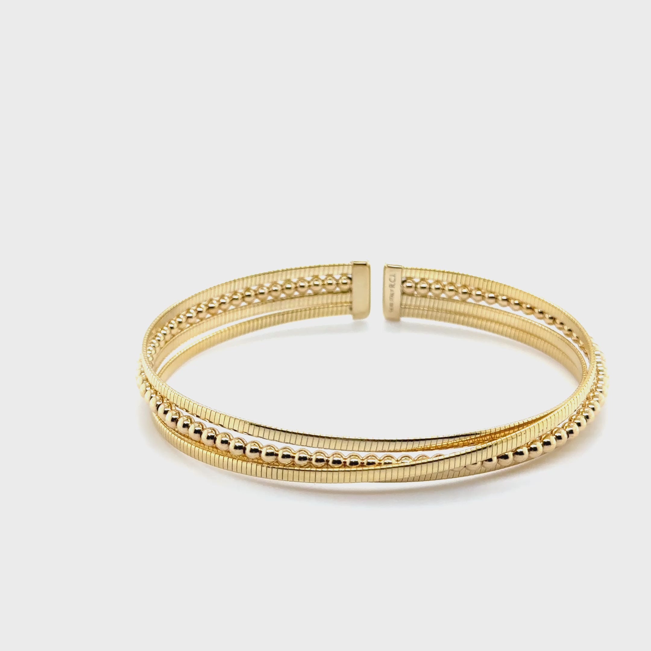 This 14K yellow gold cuff bangle features three overlapping omega-style layers framing a bold beaded strand. Its open-ended 7" design offers a smooth, clasp-free fit that contours comfortably to the wrist. At 7.8mm wide and 15.10 grams, it's a standout piece with everyday wearability.