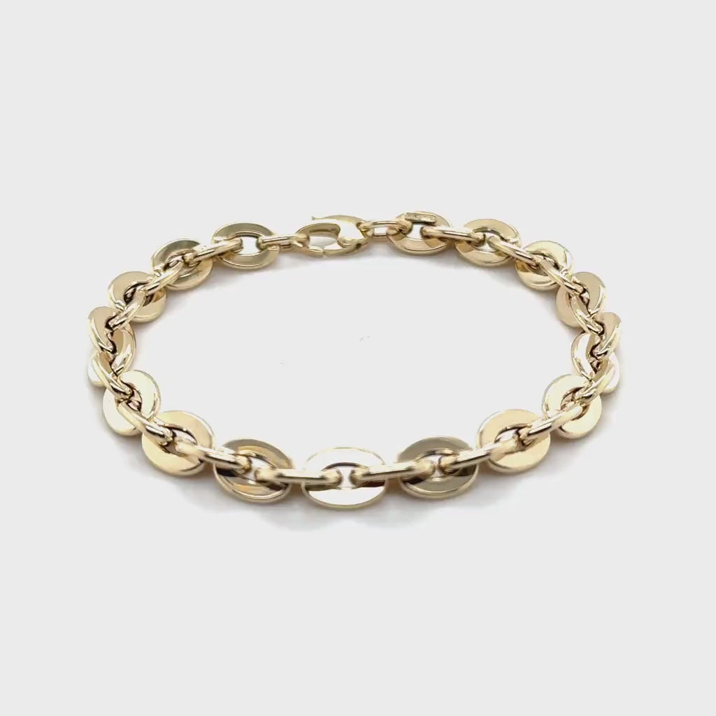 Crafted in 14K solid yellow gold, this flat oval rolo link bracelet is designed with 7.5 mm wide interlocking links that give it a bold yet refined look. Measuring 7.5 inches long and weighing 5 grams, it is secured with a sturdy lobster claw clasp for everyday reliability. The smooth, polished finish enhances its timeless appeal, while the solid gold construction ensures resistance to tarnish and water. Elegant and versatile, this bracelet transitions effortlessly from casual wear to formal occasions, making it a lasting addition to any jewelry collection.