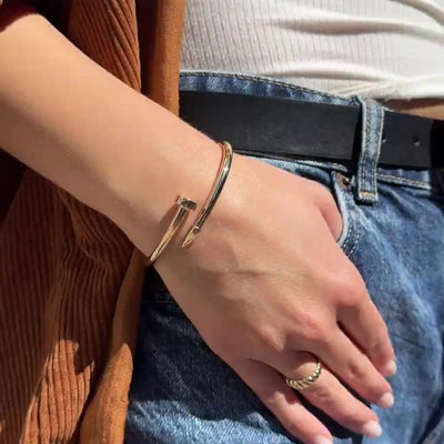 This 14K yellow gold bangle features a sleek coiled nail-inspired silhouette with smooth curves and a polished finish. At 4mm thick and 8.7 grams, the 7.25" hinged cuff is both bold and comfortable. Made of real gold, resistant to tarnish and water.