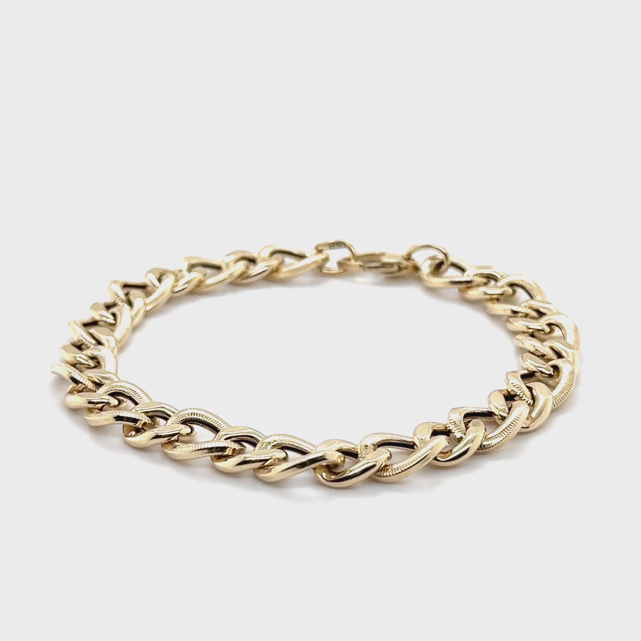 Impeccably crafted from 14K Yellow Gold, this oval link bracelet features a bold interplay of twisted textured links and smooth polished connectors that catch the light from every angle. The chunky 9 mm width gives it a confident presence while still feeling refined and wearable for everyday styling or special occasions. Measuring 7.25 inches in length and weighing approximately 5.00 grams, it offers a balanced feel on the wrist with a secure lobster claw closure for reliable wear. Designed for durability and comfort, this solid gold piece is hypoallergenic, tarnish resistant, and water safe, making it a timeless addition to any fine jewelry collection or a thoughtful luxury gift.