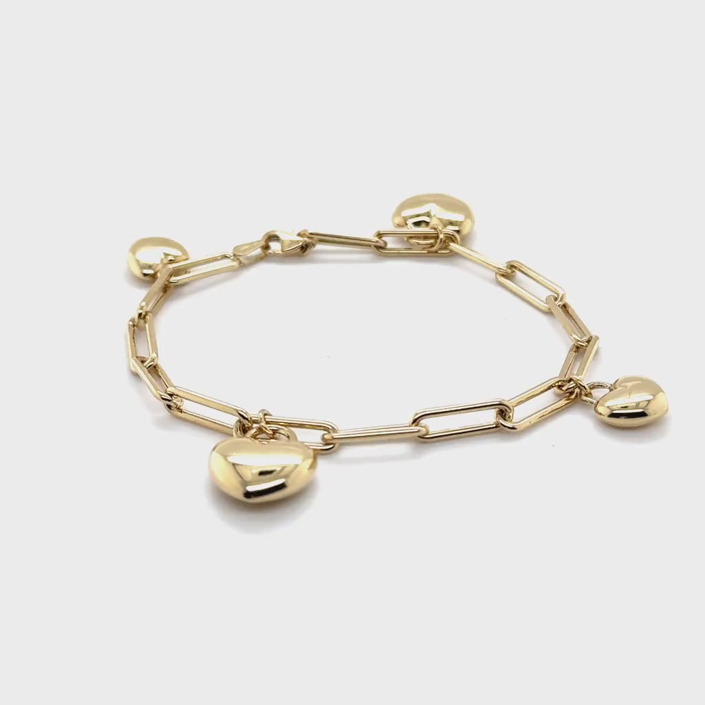 Fall in love with the effortless charm of this 14K yellow gold bracelet, designed with a modern paperclip chain and four polished puffed heart charms. The 7.25-inch bracelet features substantial 4.5mm links, balancing bold structure with feminine detail. Two larger hearts (16x13.5mm) and two smaller hearts (11x10mm) create a captivating movement, catching the light with every gesture. Finished with a secure lobster clasp, this piece blends durability and elegance, making it perfect for both daily wear and layering with other favorites.