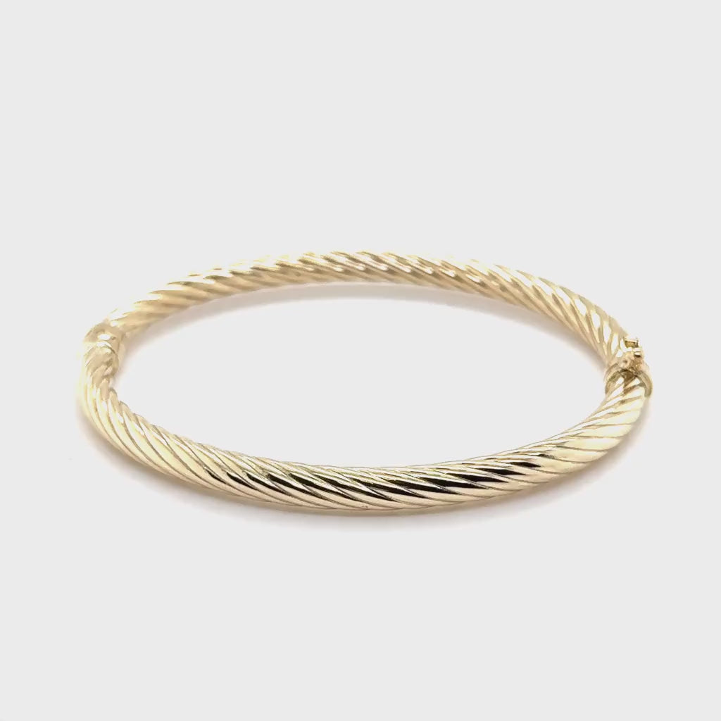 Crafted from 14K yellow gold, this 7" bangle features a classic twisted rope texture in a 5mm wide profile. Weighing 9 grams, it's secured with a box clasp and safety latch for lasting wear. Water and tarnish resistant with a timeless silhouette.