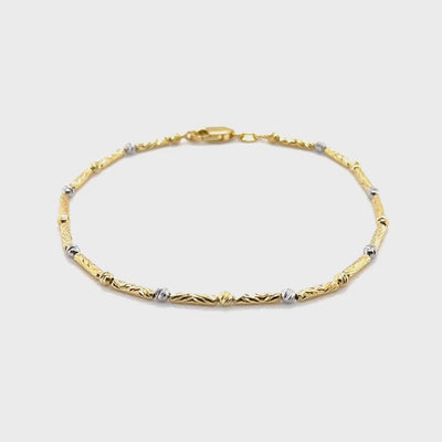 This 14K two-tone gold bracelet blends craftsmanship and style with alternating textured yellow gold bars and polished white gold beads for a refined, contrasting look. The twist bar chain design enhances its unique texture, making it versatile enough for everyday wear or a subtle statement on special occasions. Crafted from genuine gold, this bracelet is resistant to tarnish and water, ensuring durability and lasting shine.