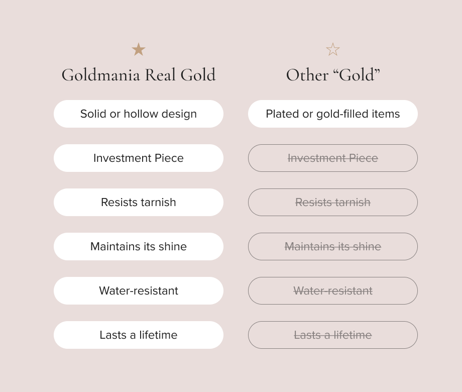 Not all gold is created equal. At Goldmania Jewelry, we believe in the unmatched quality of real gold—pure, timeless, and designed to last forever. Unlike plated or filled jewelry that fades, chips, or tarnishes, our real gold pieces maintain their brilliance for a lifetime. Waterproof, tarnish-proof, and always radiant, real gold is an investment in beauty that never loses its shine.
