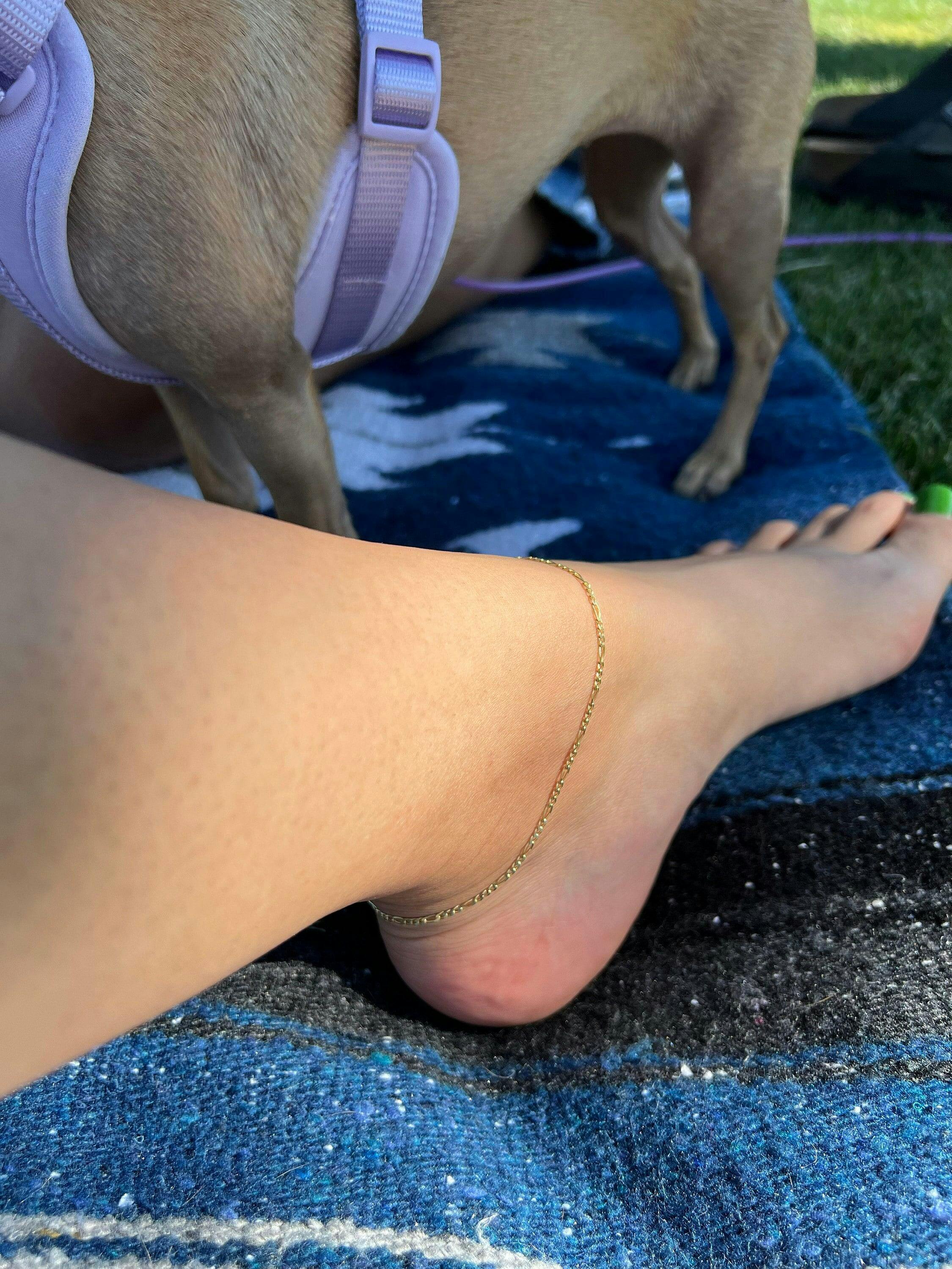 14K yellow gold Figaro link anklet chain secured with a spring ring clasp.