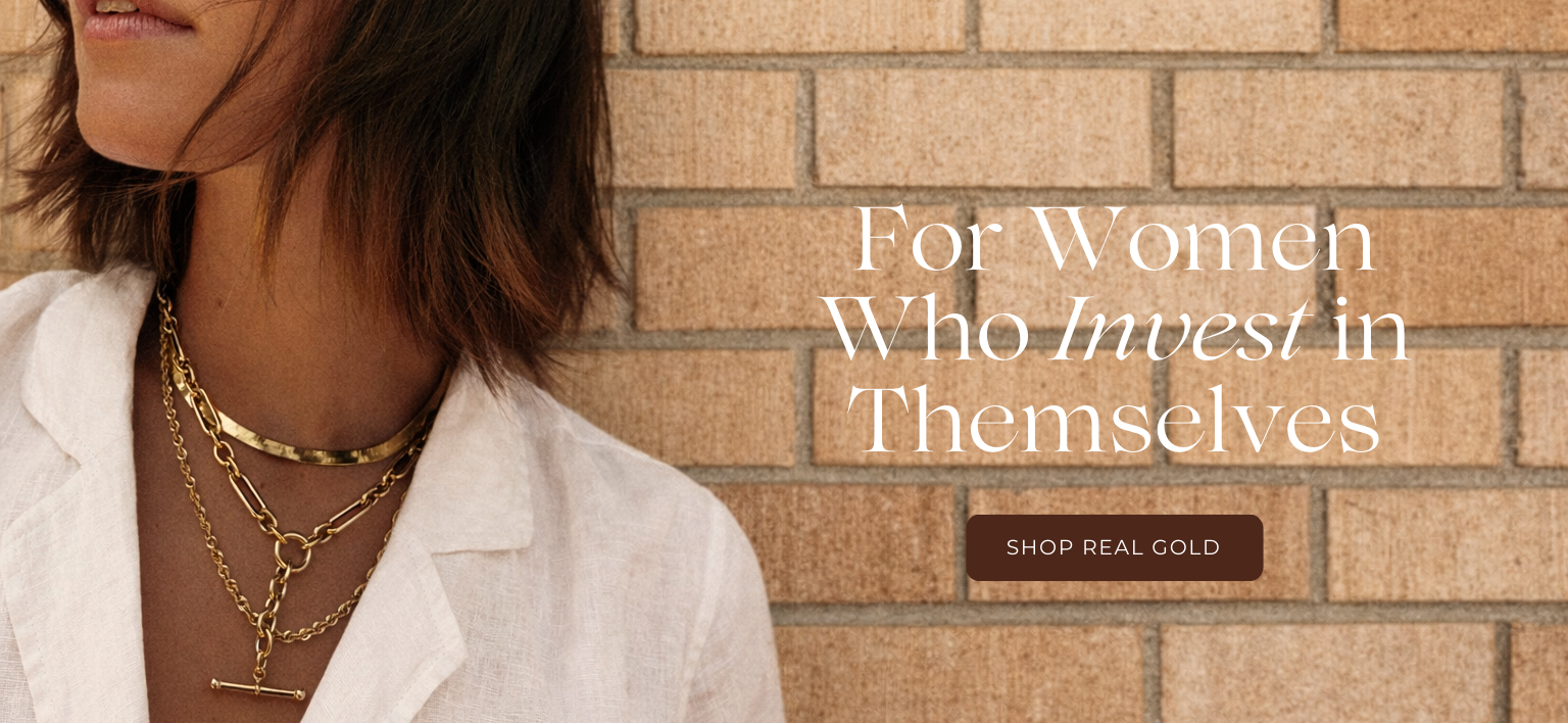 Every piece is crafted in solid 14k or 10k gold, never plated, never filled, and never vermeil. Solid gold keeps its value and keeps you out of the cycle of buying jewelry that does not last. Our jewelry is waterproof, tarnish resistant, and safe for sensitive skin, which makes it perfect for everyday wear. We use real materials that empower women to invest in pieces they can wear for life.